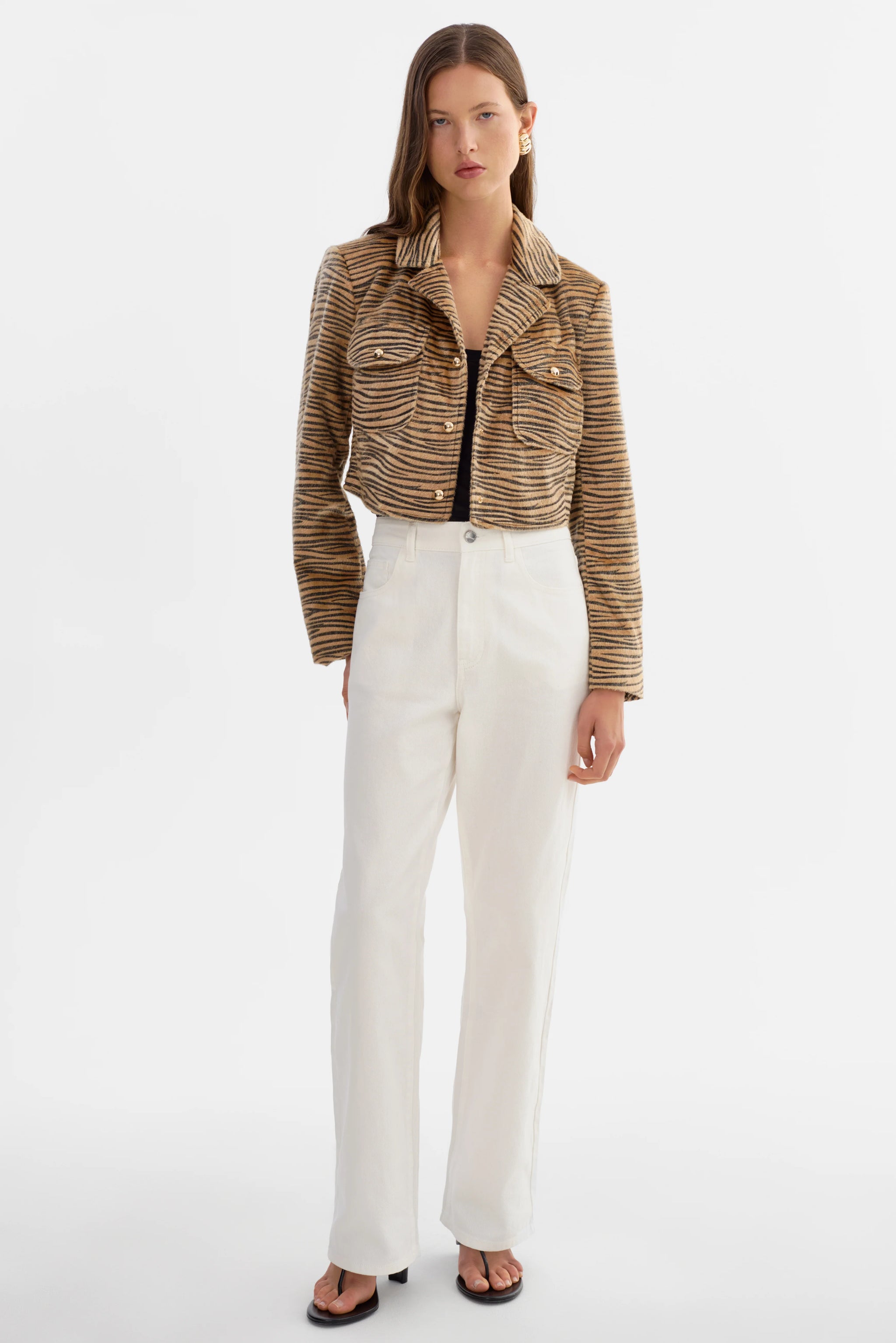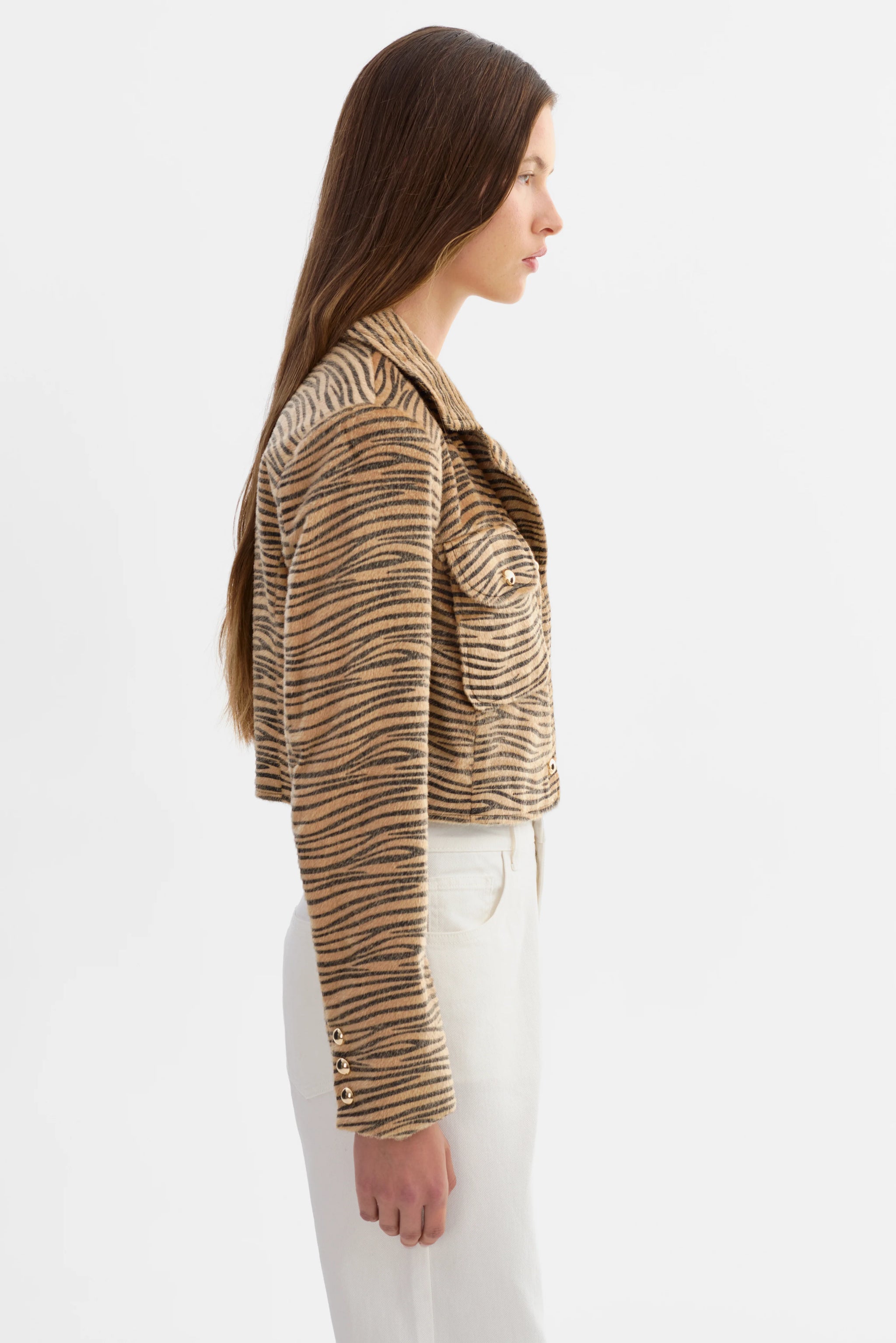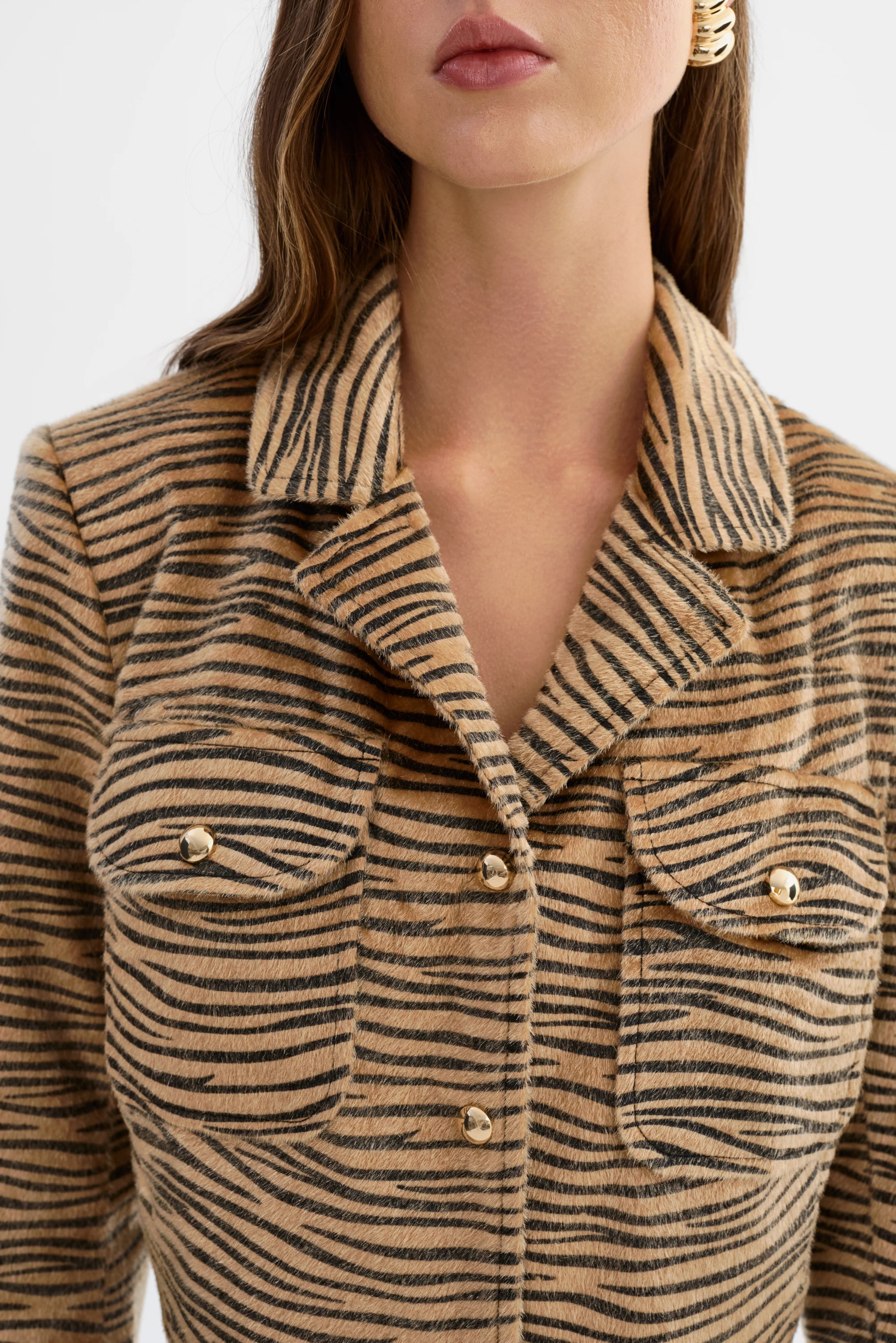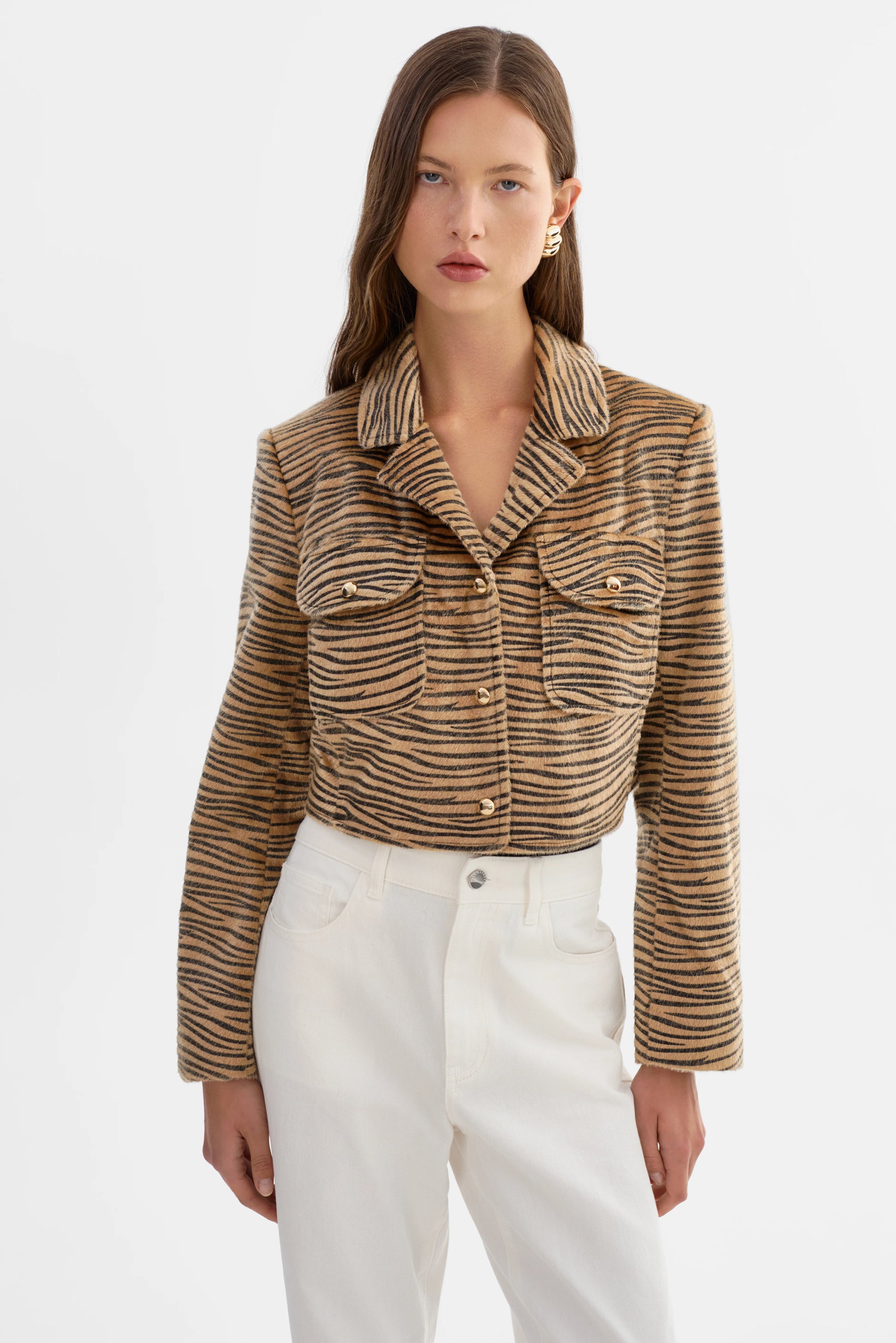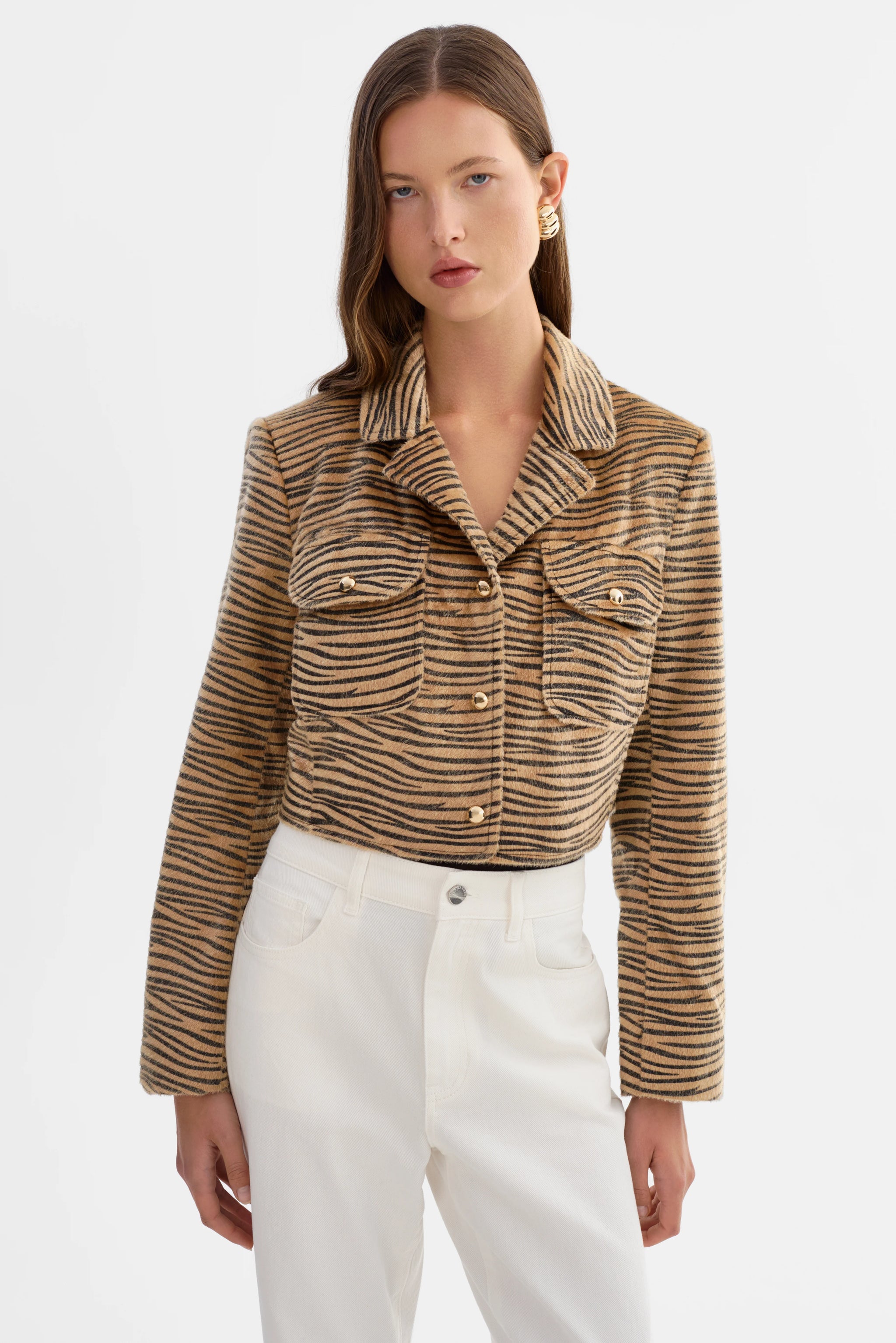 The JAYLEE Jacket offers a refined take on a classic silhouette. Crafted in faux hair tiger print, it features a notched collar, gold snap closures,...