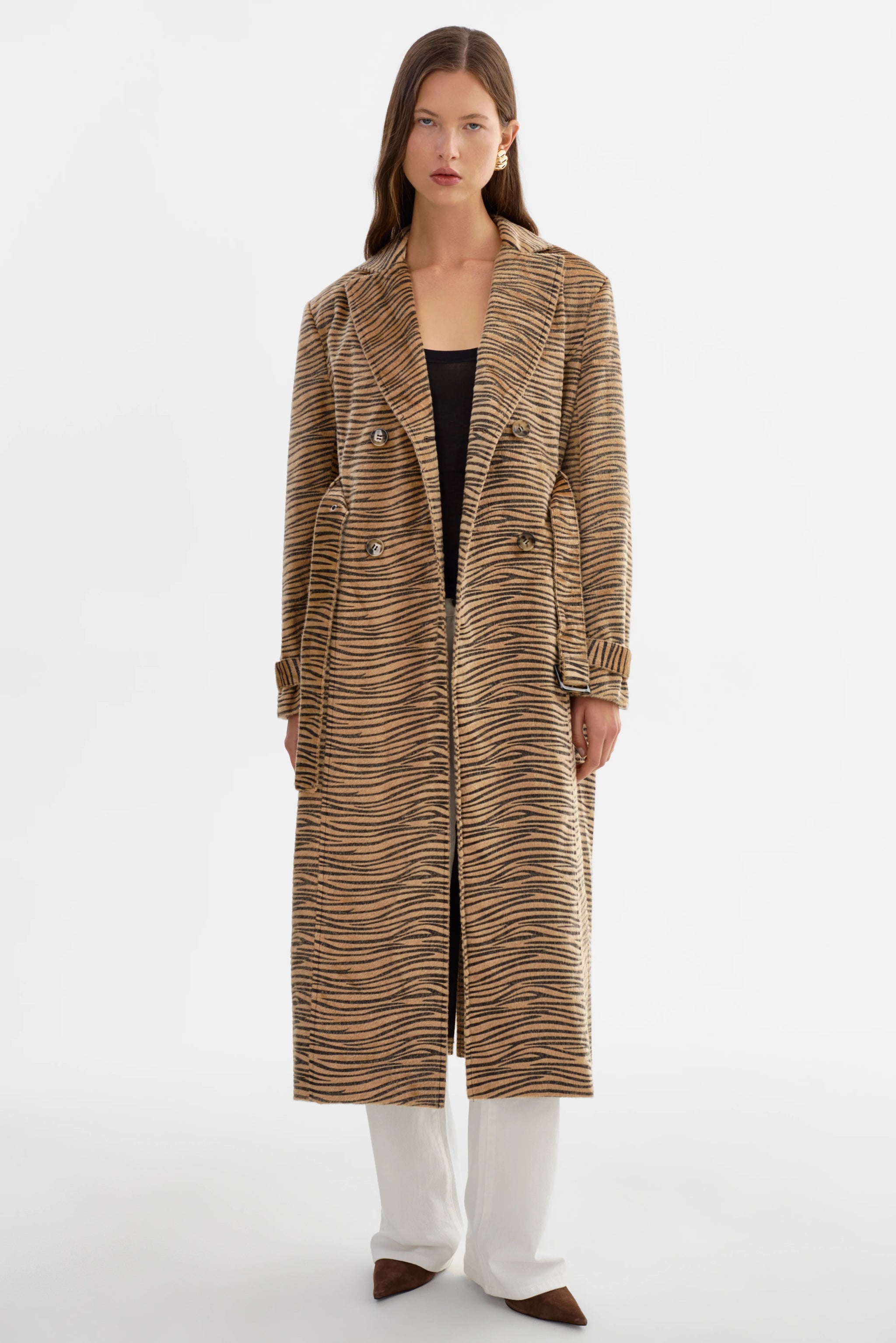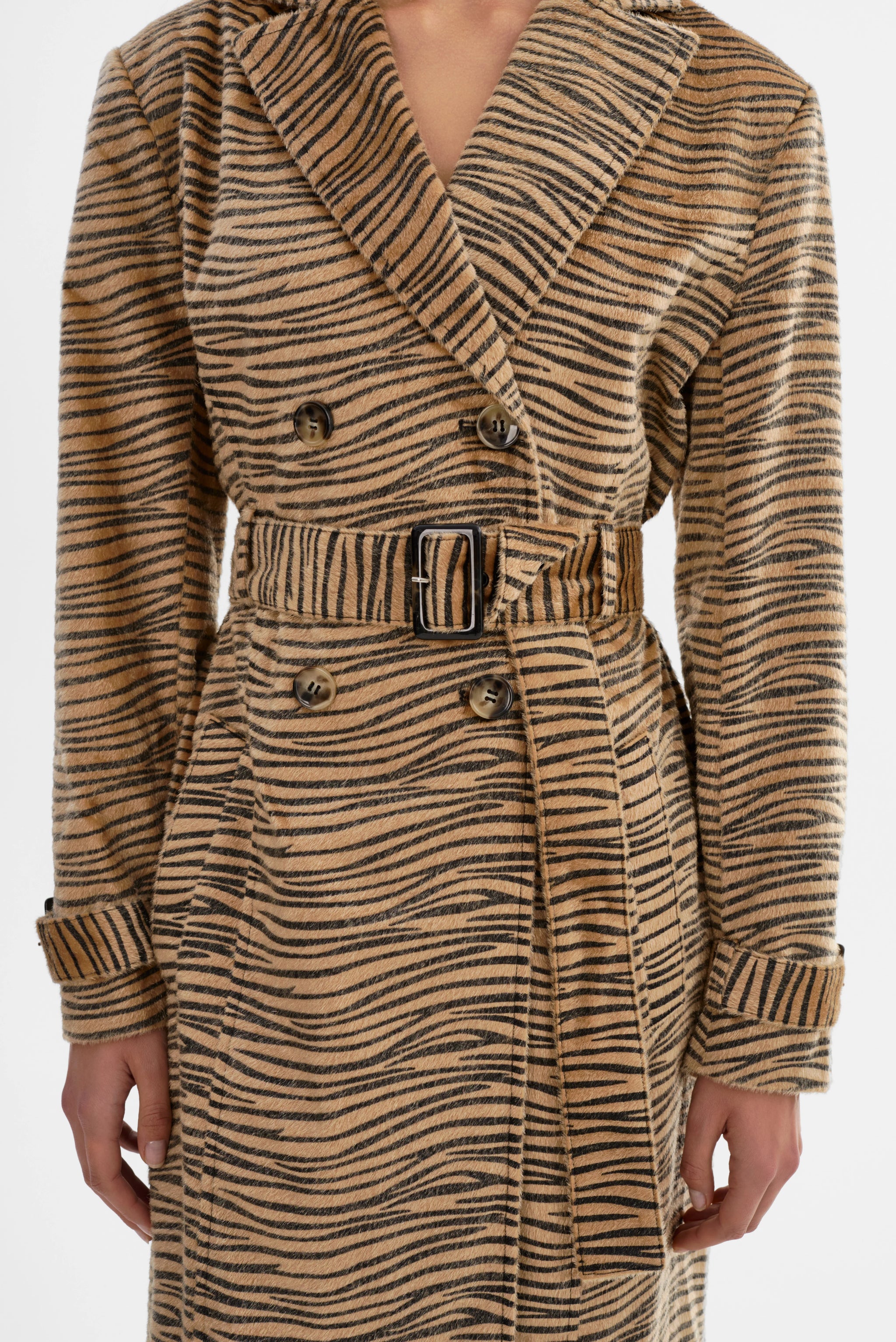 The LESLIE Trench Coat brings modern sophistication to a timeless silhouette. Made from a faux hair tiger print fabric, it features a notched collar, belted...