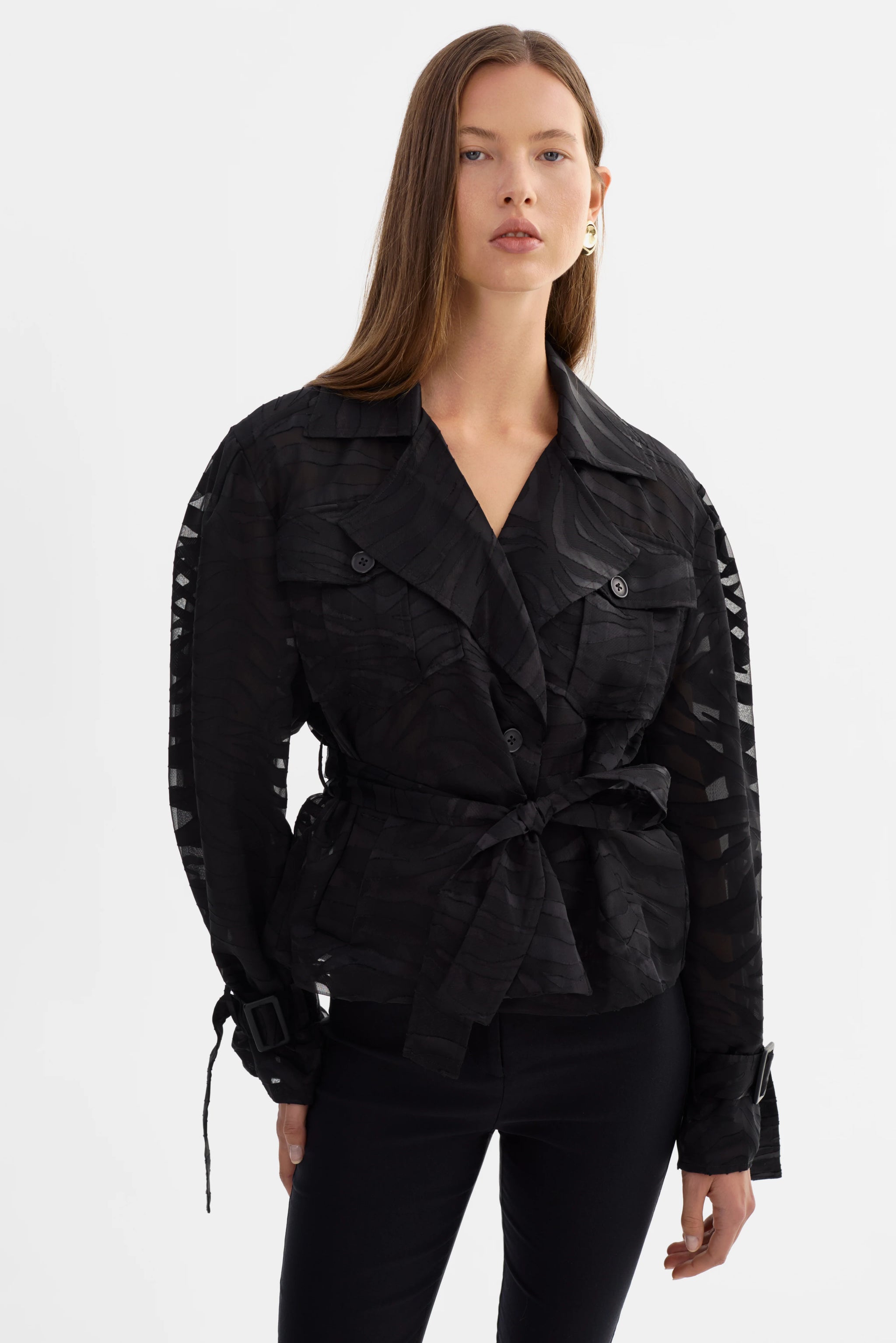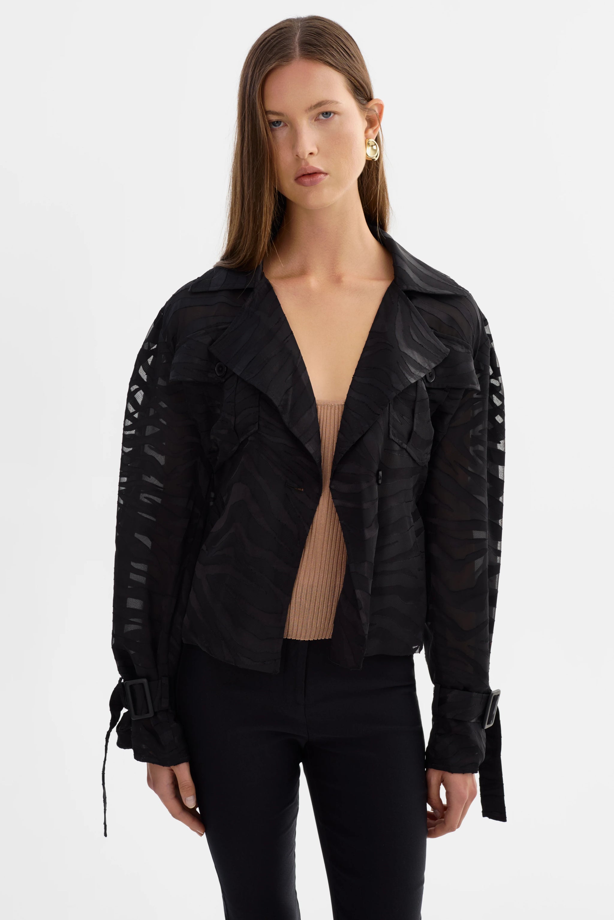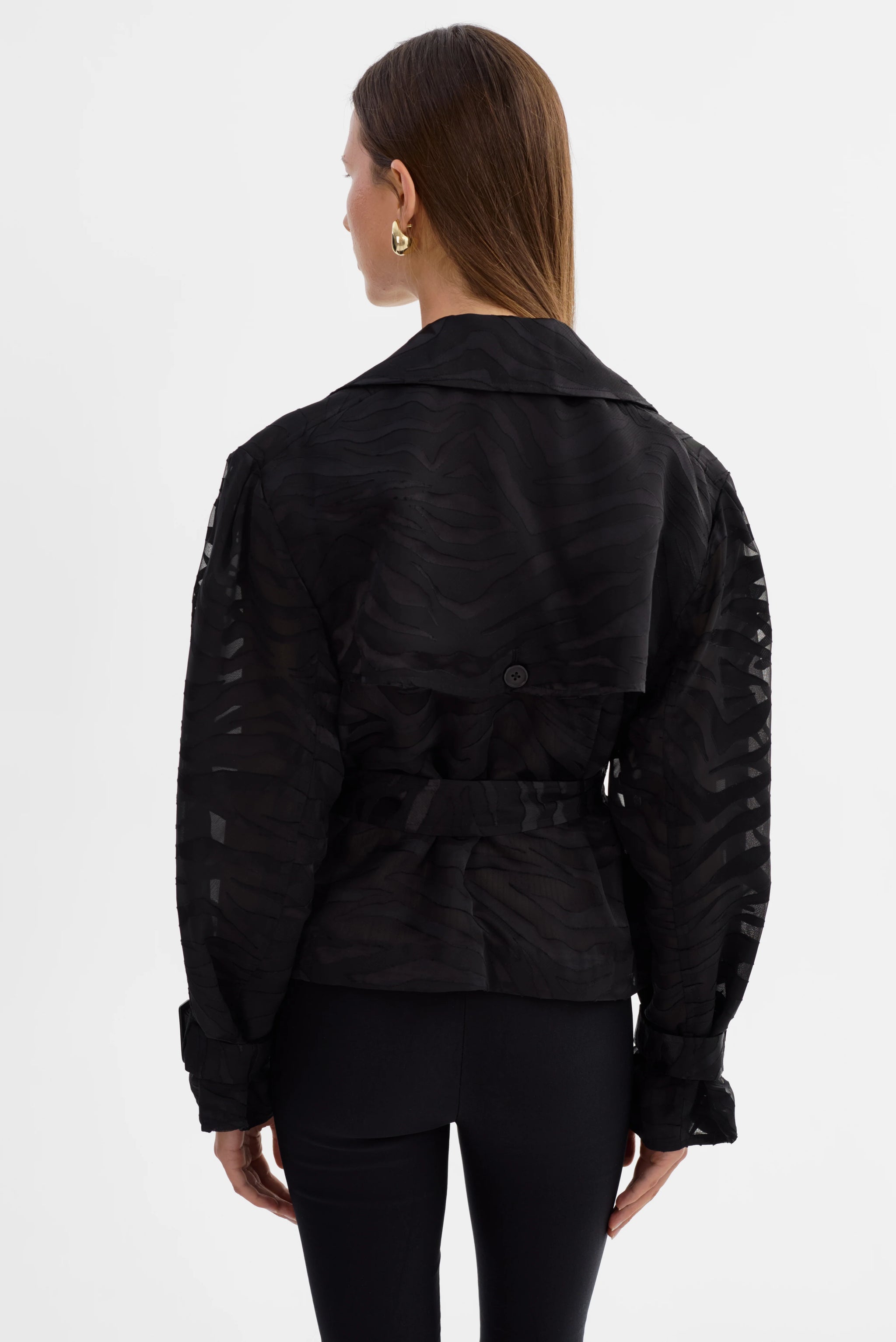 The MARKEESA Jacket offers a modern take on a classic trench. Made from sheer zebra chiffon, it features a notched lapel, belted waist, and voluminous...