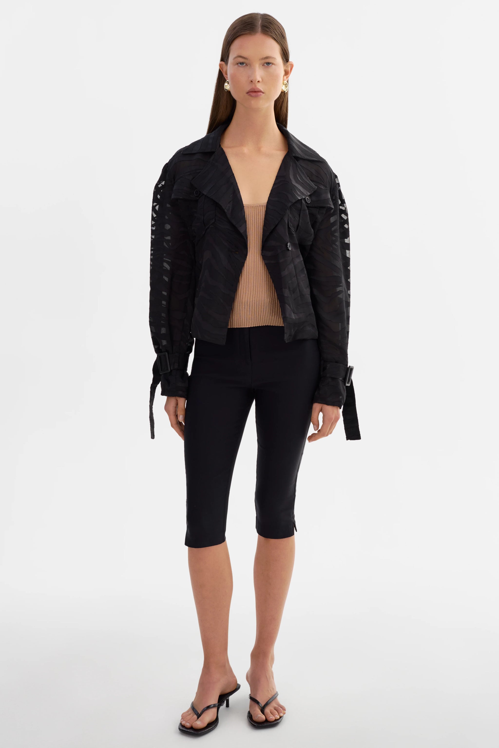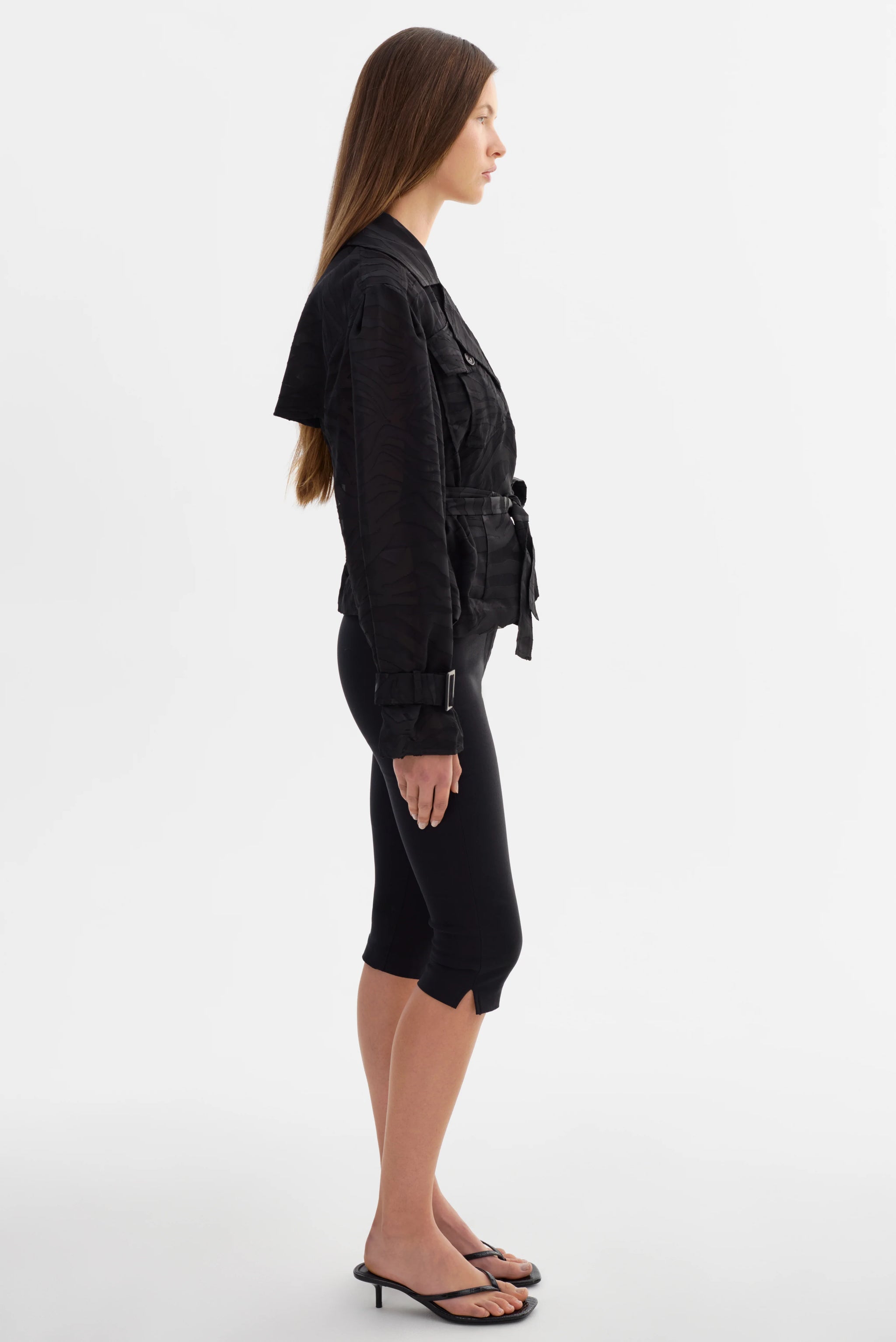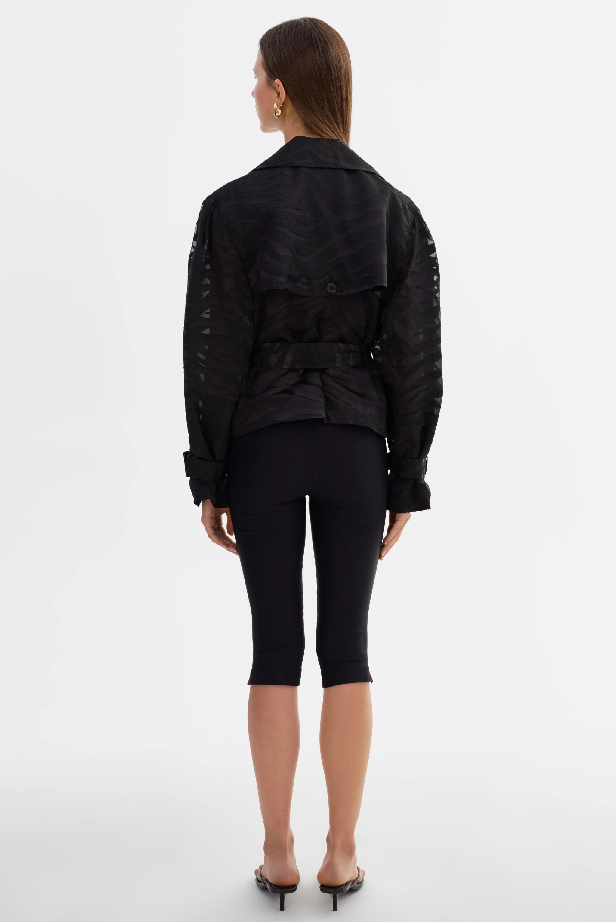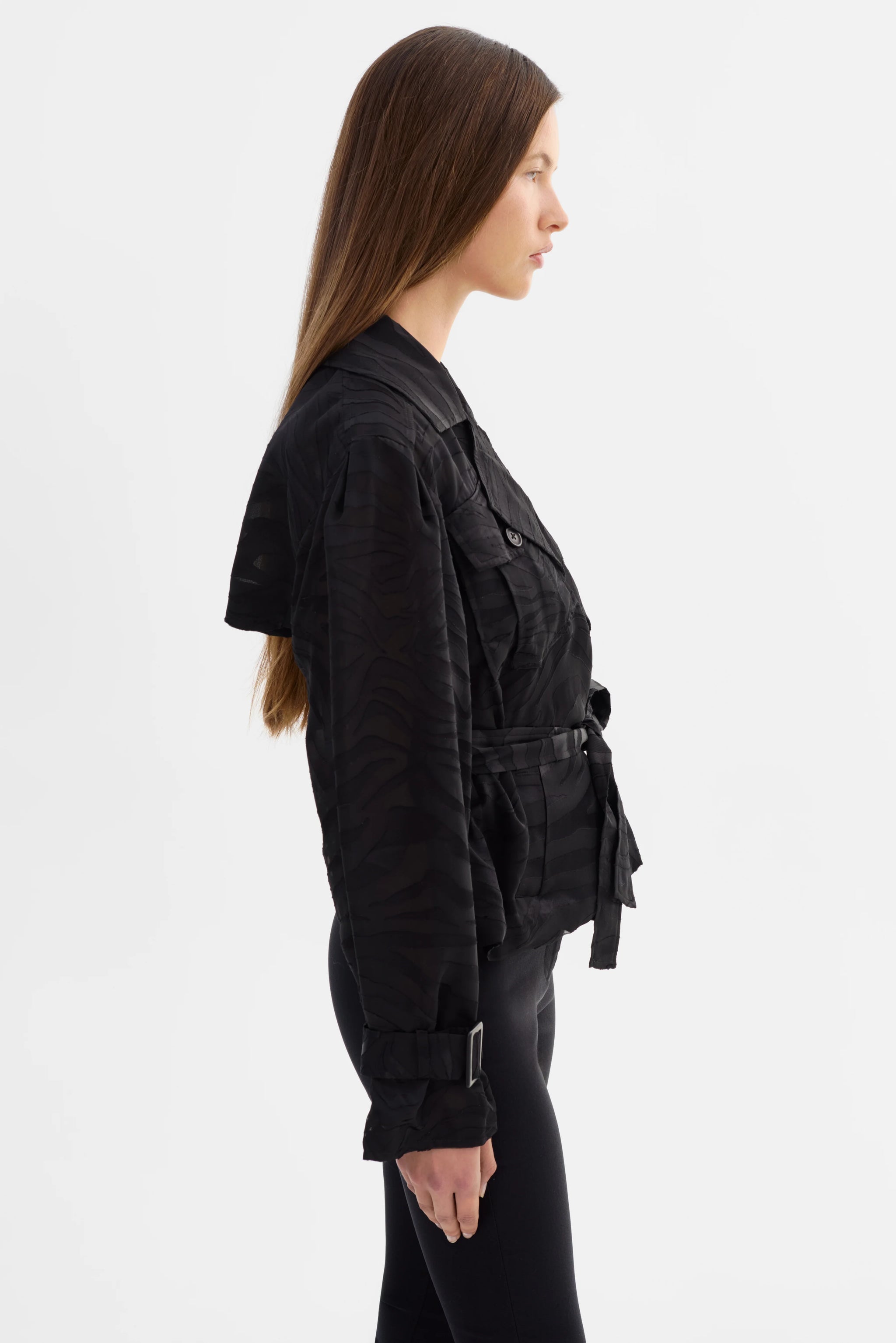 The MARKEESA Jacket offers a modern take on a classic trench. Made from sheer zebra chiffon, it features a notched lapel, belted waist, and voluminous...