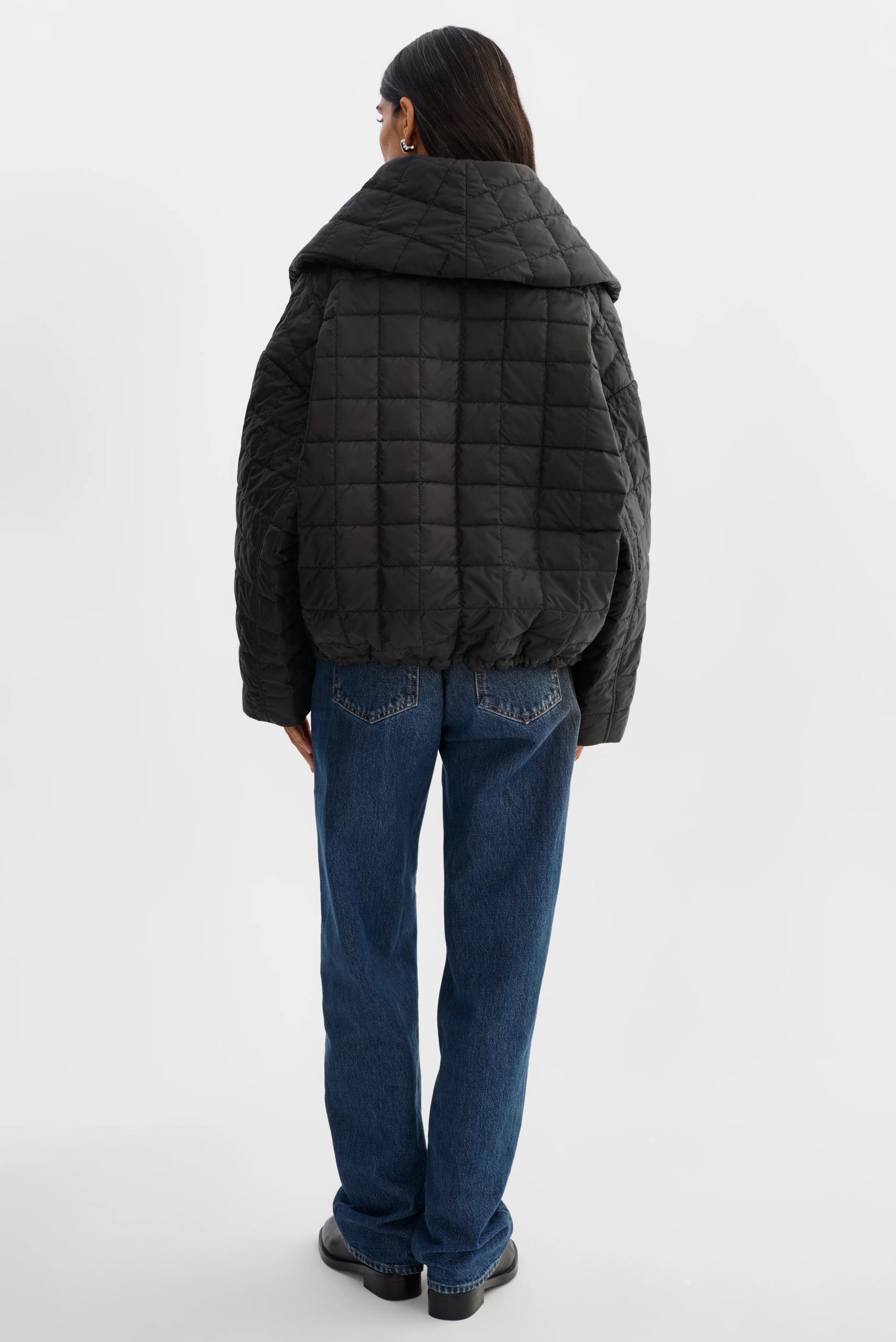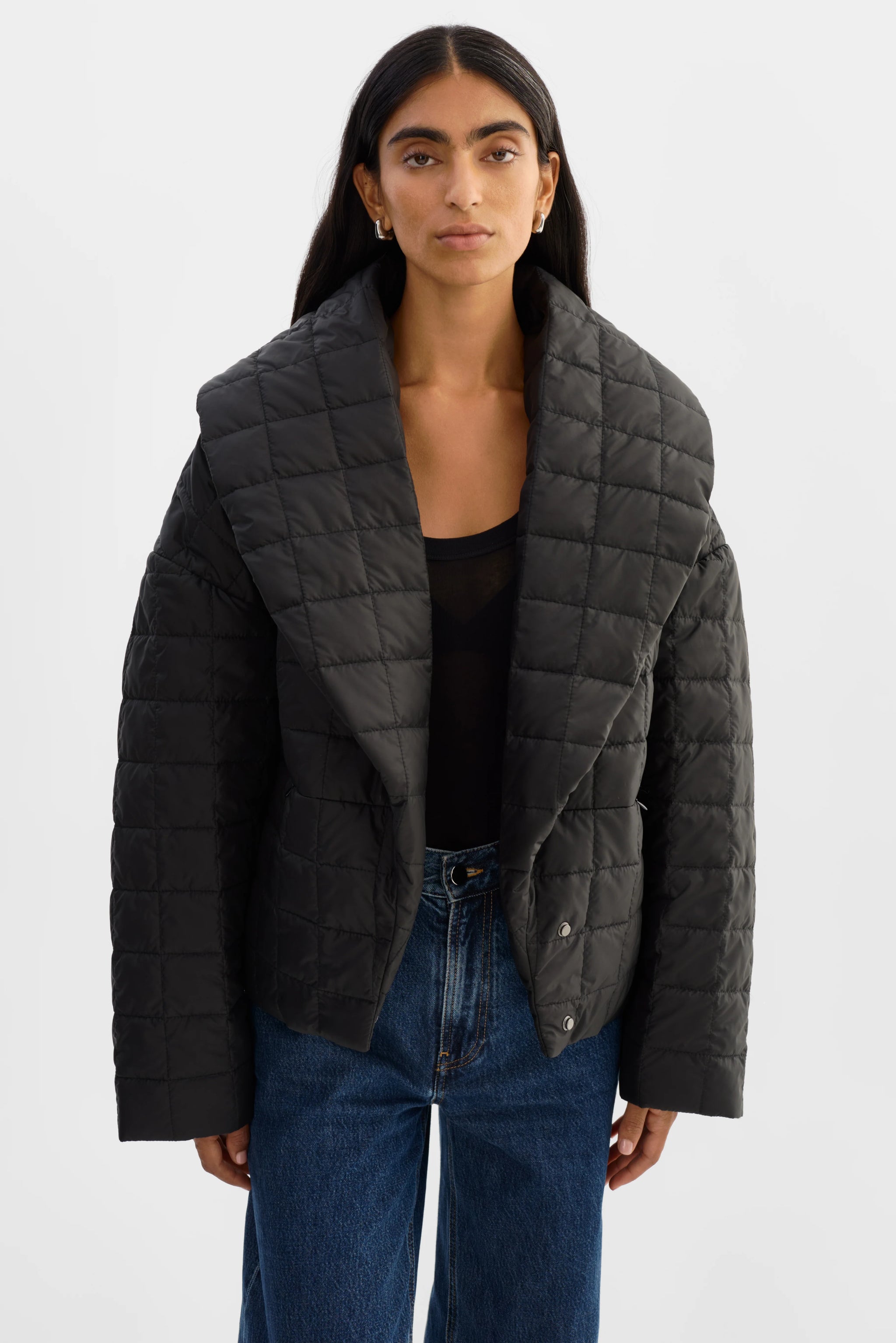 Where softness meets structure. The MELISSA Quilted Padded Coat features a voluminous shawl collar and sculptural silhouette, brought to life in a lightweight quilted shell....