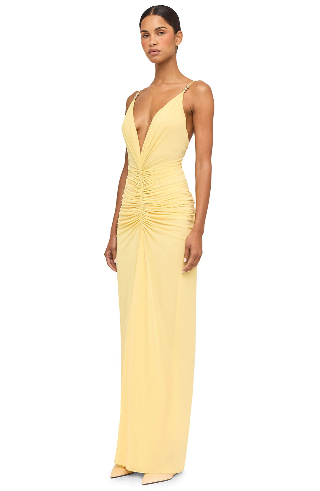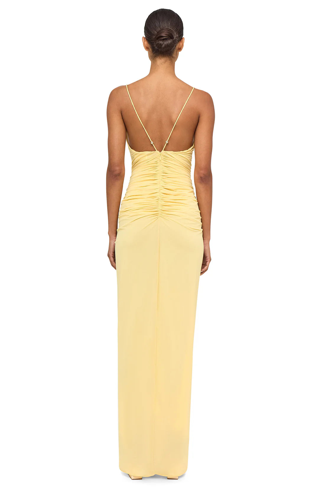 Soft structure, saturated color, refined detail. The Anya Dress in banana is minimal in shape with a long, tailored silhouette and subtle gold-accented straps. Effortlessly...