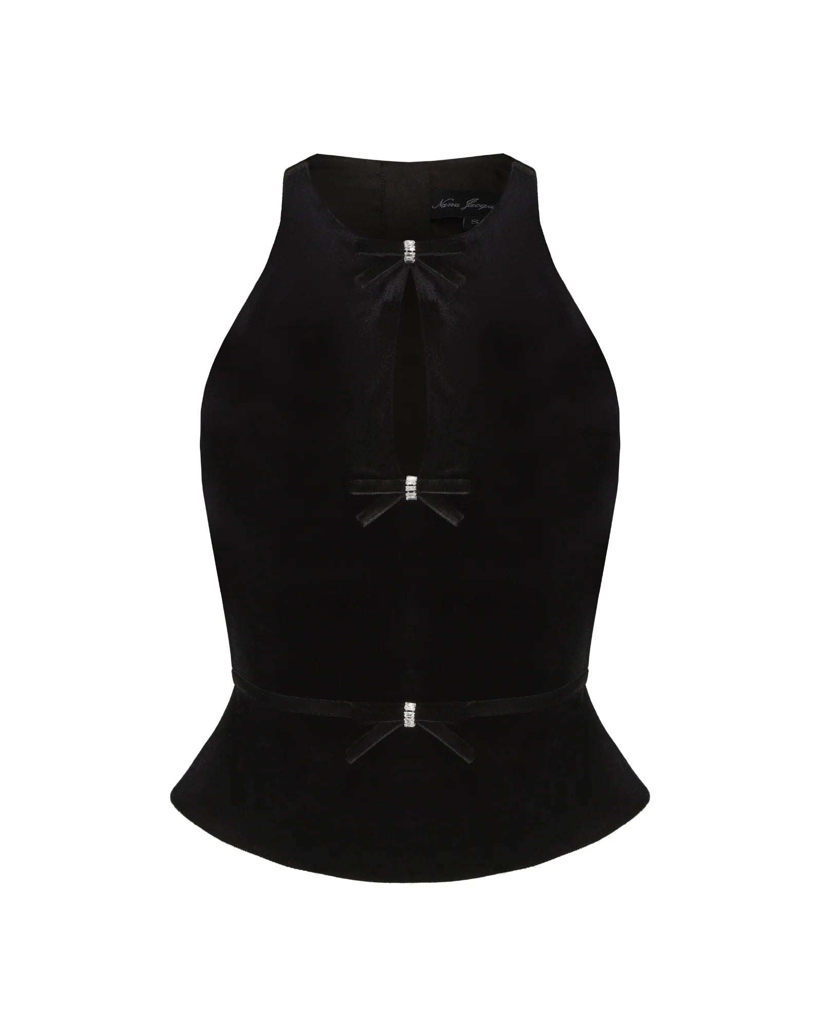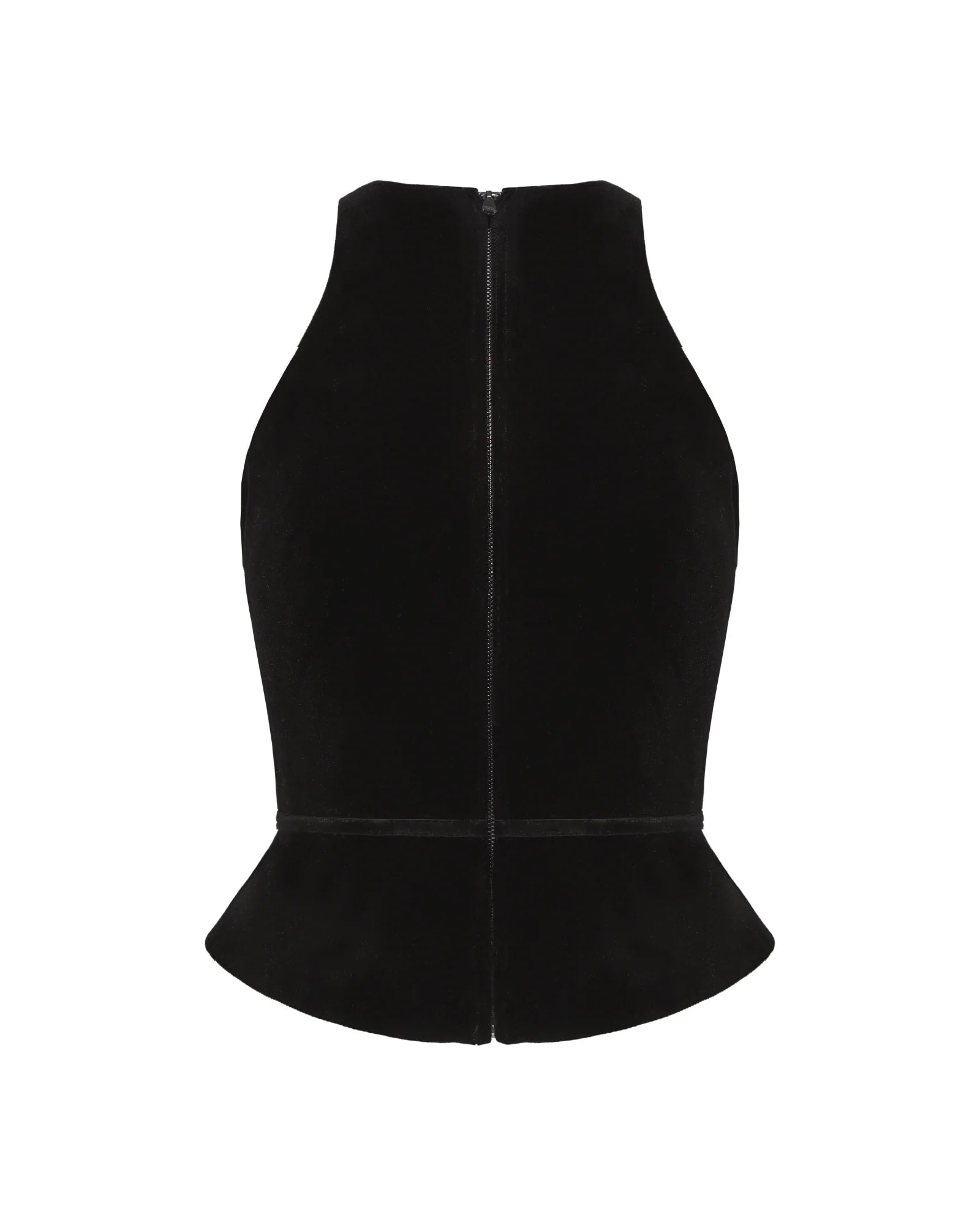 The Estelle Velvet Top captures vintage Hollywood allure in soft black velvet. Inspired by film noir fashion, this luxury women’s top sculpts the silhouette with...