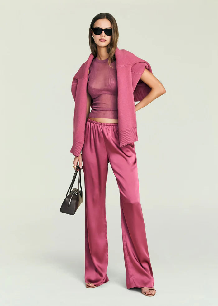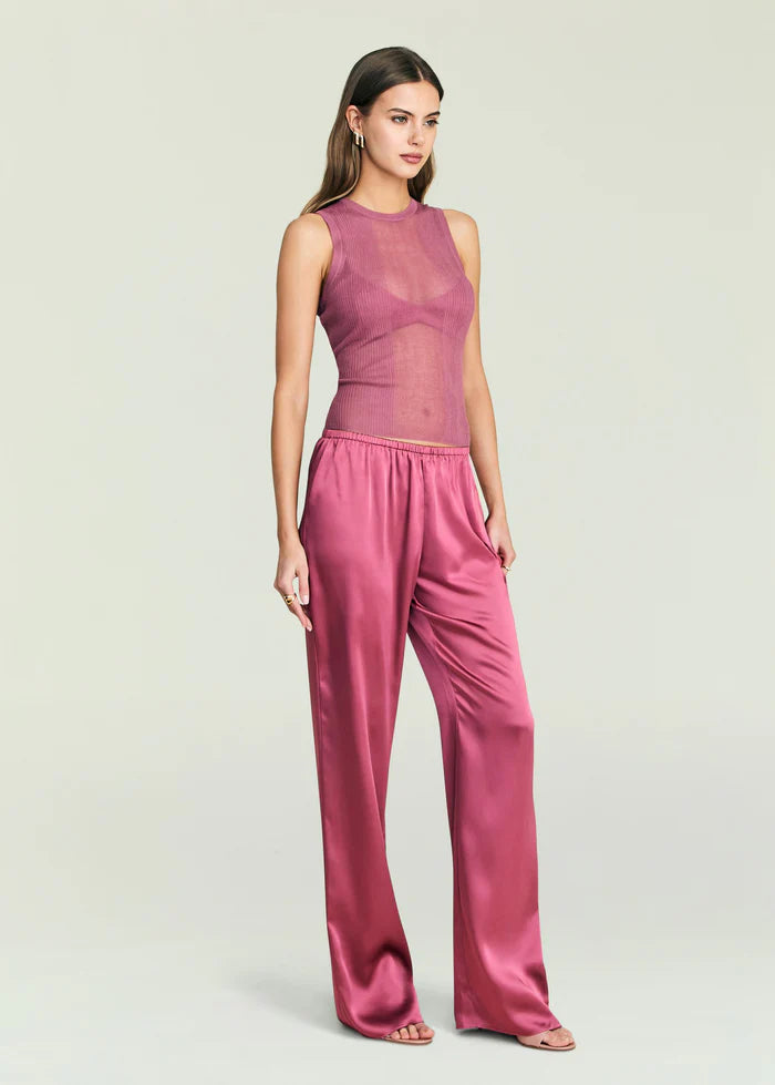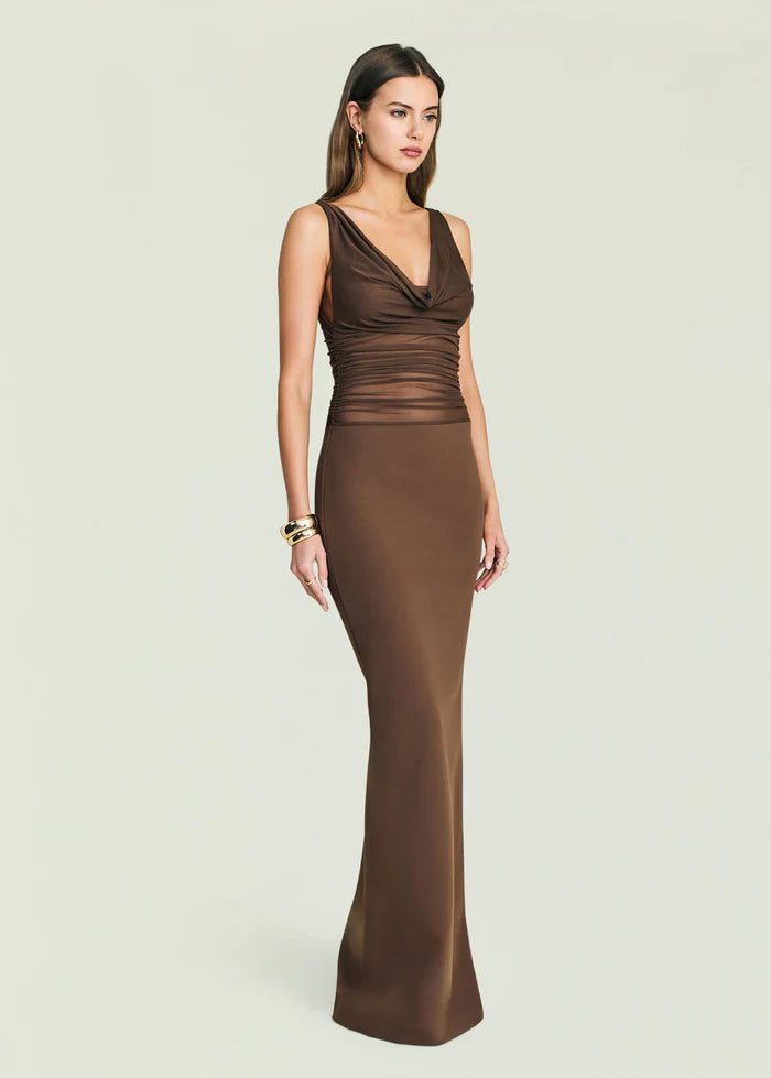 Mock neck gown with blouson bodice and skirt. Semi-sheer fabrication throughout. Shown here in Petal Pink. 100% Lyocell Made in China Model is 5'10" wearing...