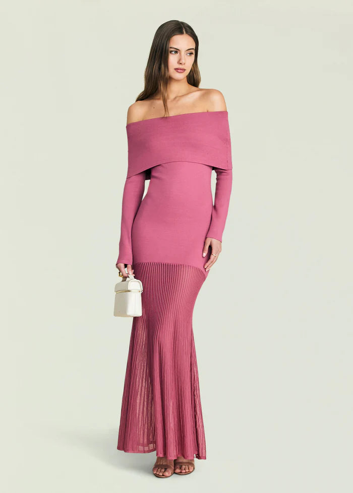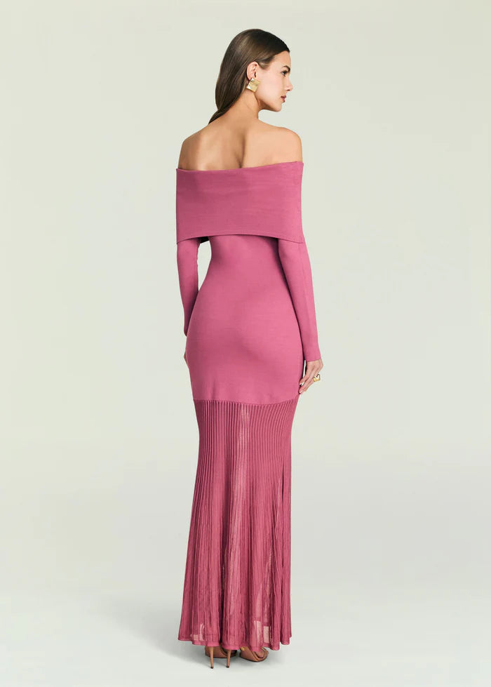 Off-the-shoulder, knit long sleeve maxi dress with sheer skirt. Shown here in Pinot. 70% Viscose, 30% Polyester Made in China Model is 5'10" wearing size...