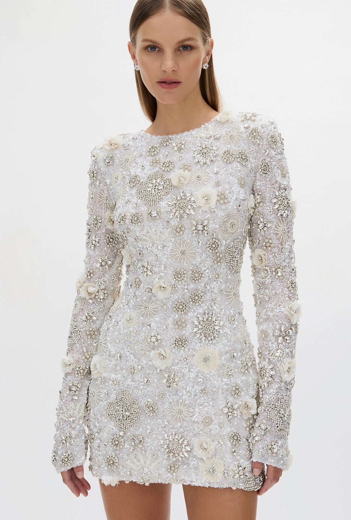 Designed to make a bold statement. Fitted through the waist, the Francesca Mini features densely embellished glass beads and laser cut sequin. The raised neckline...