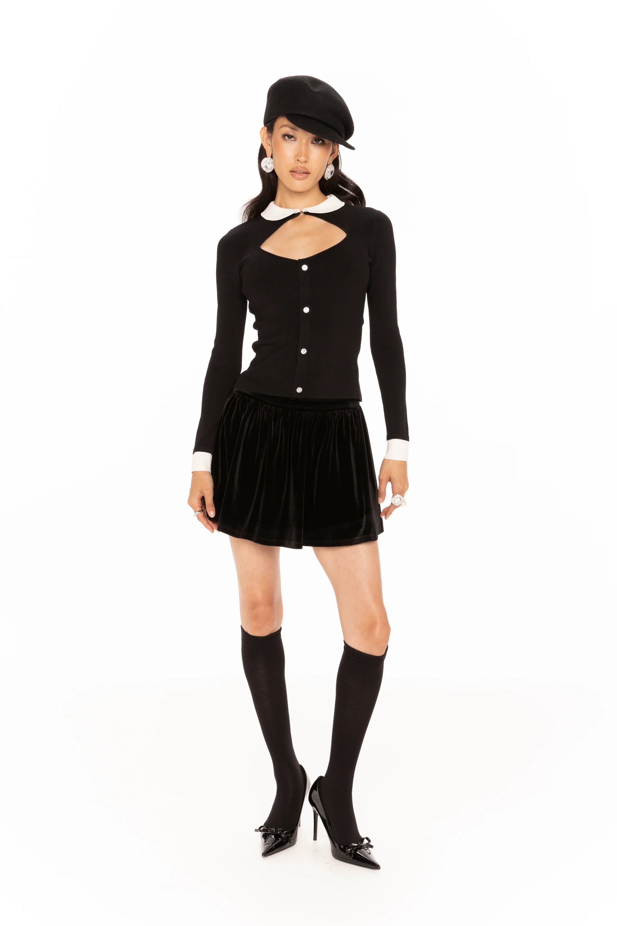 The Estelle Velvet Top captures vintage Hollywood allure in soft black velvet. Inspired by film noir fashion, this luxury women’s top sculpts the silhouette with...