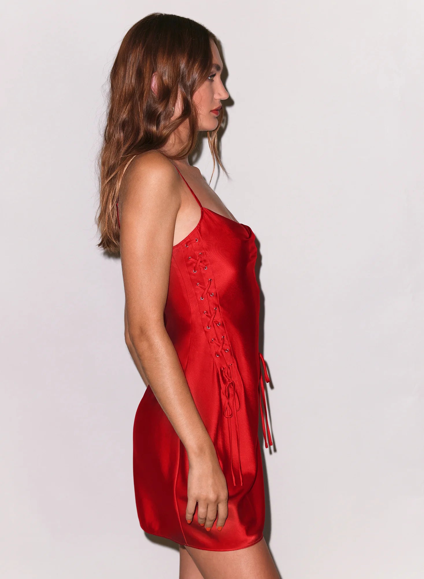 Our ultra chic Ella Mini Dress, cut from stretch silk charmeuse with cowl neckline and adjustable straps. Features adjustable lace up detail at side for...