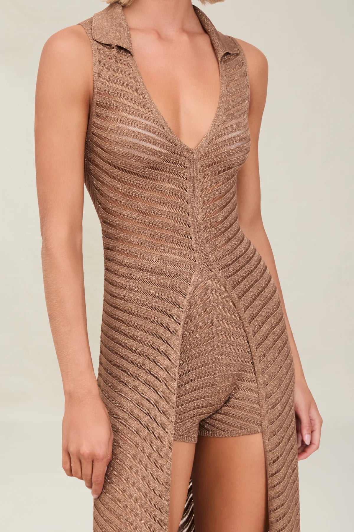 The Hallie is a metallic, knitted mini dress with adjustable ties at the shoulders for desired length. Hand wash in cold water. Do not bleach....