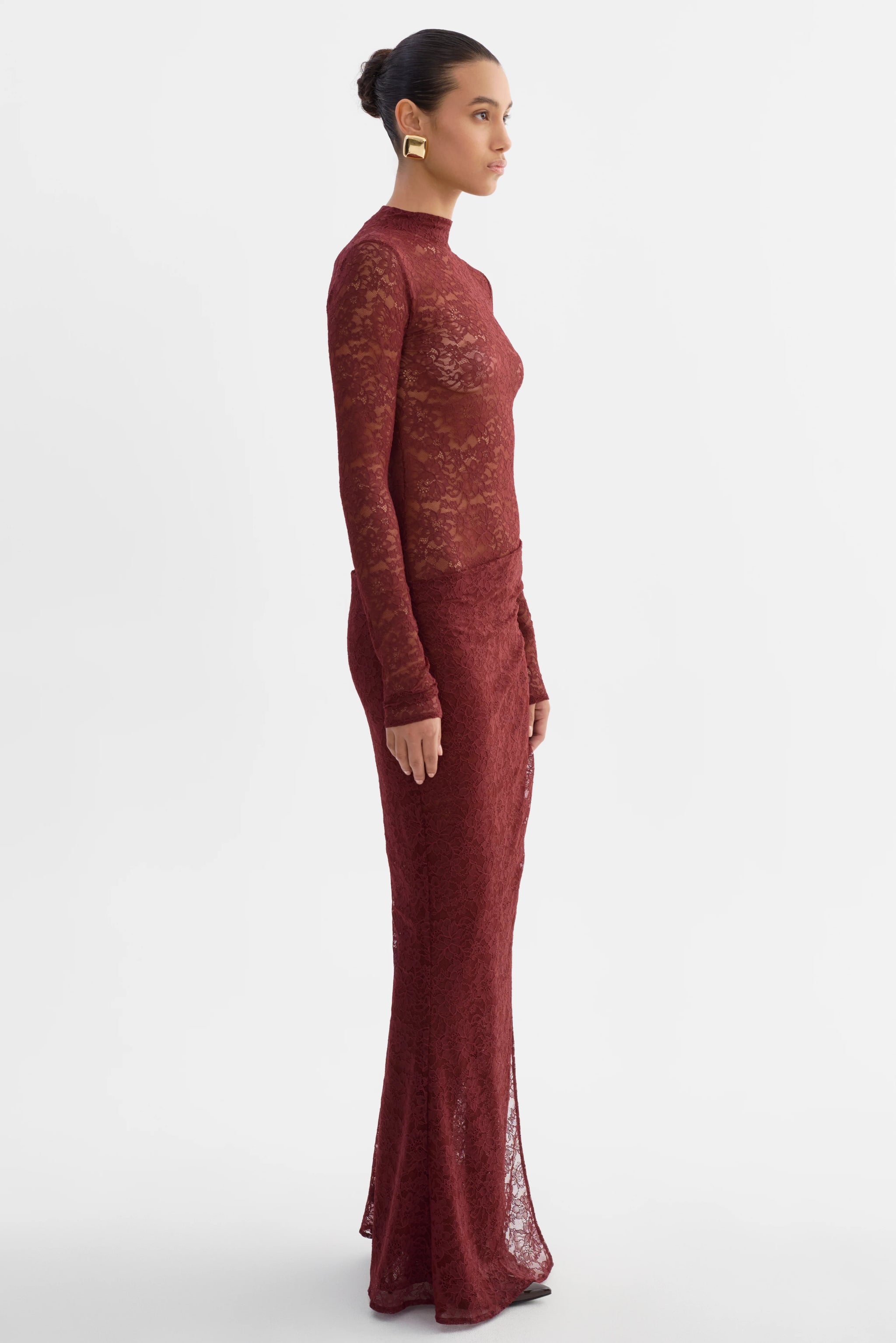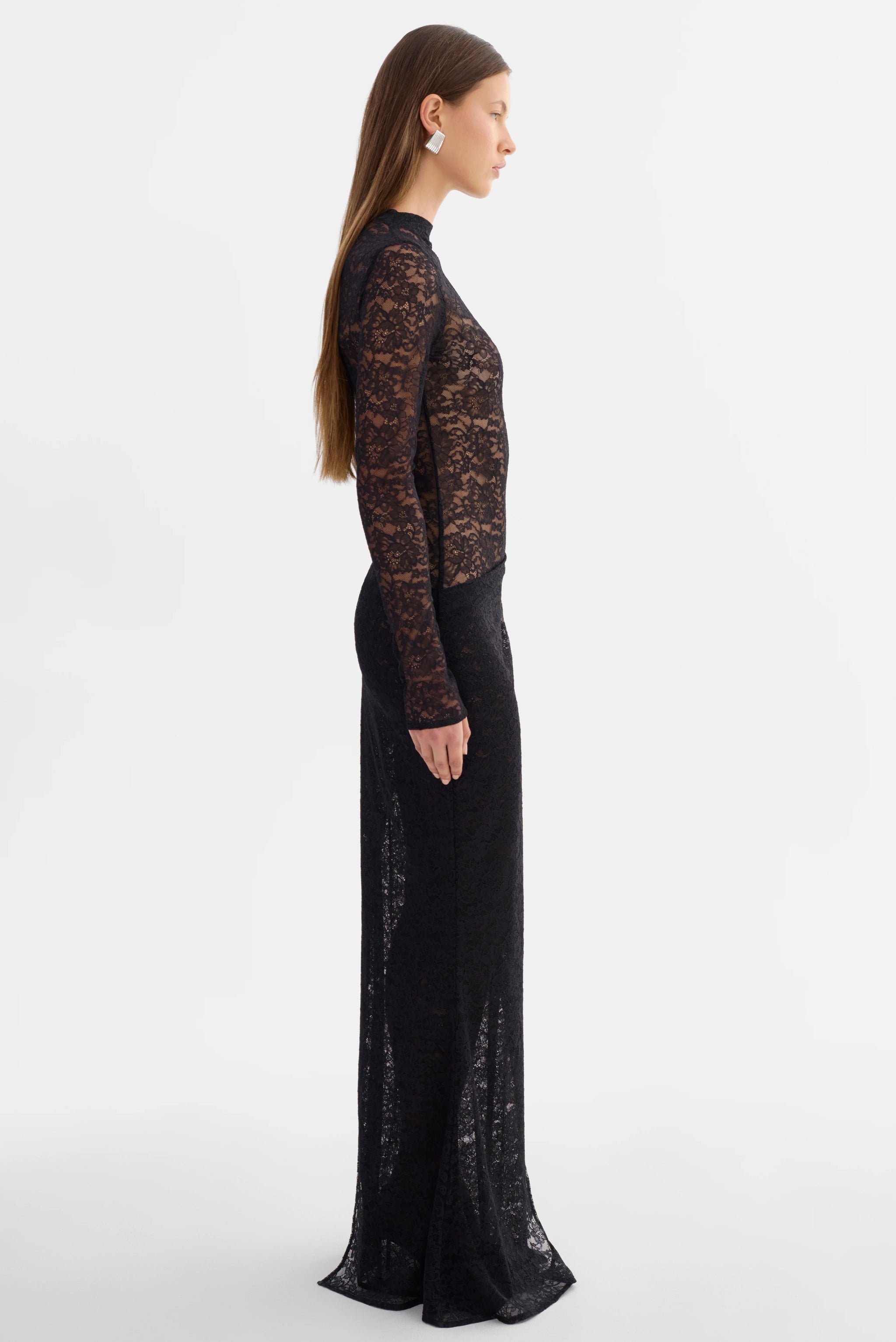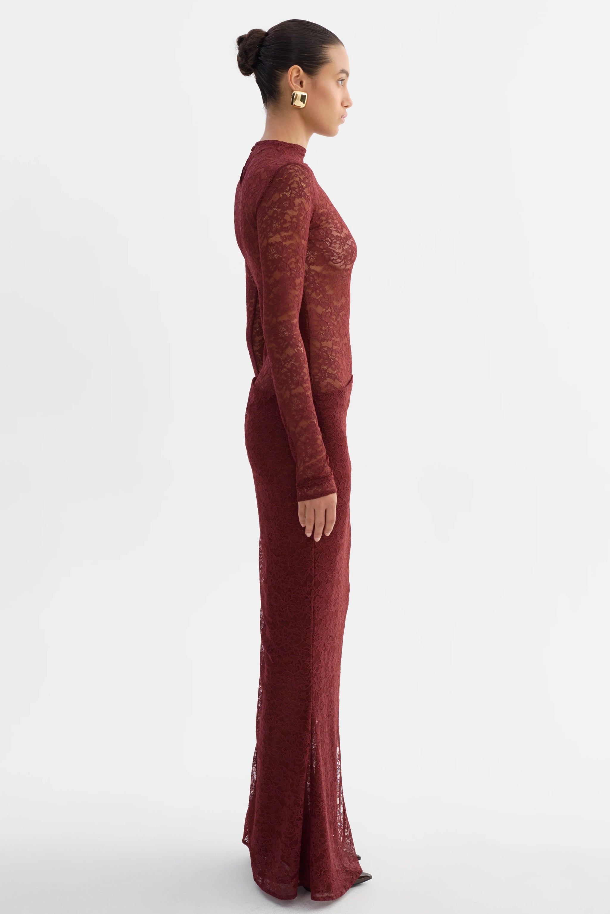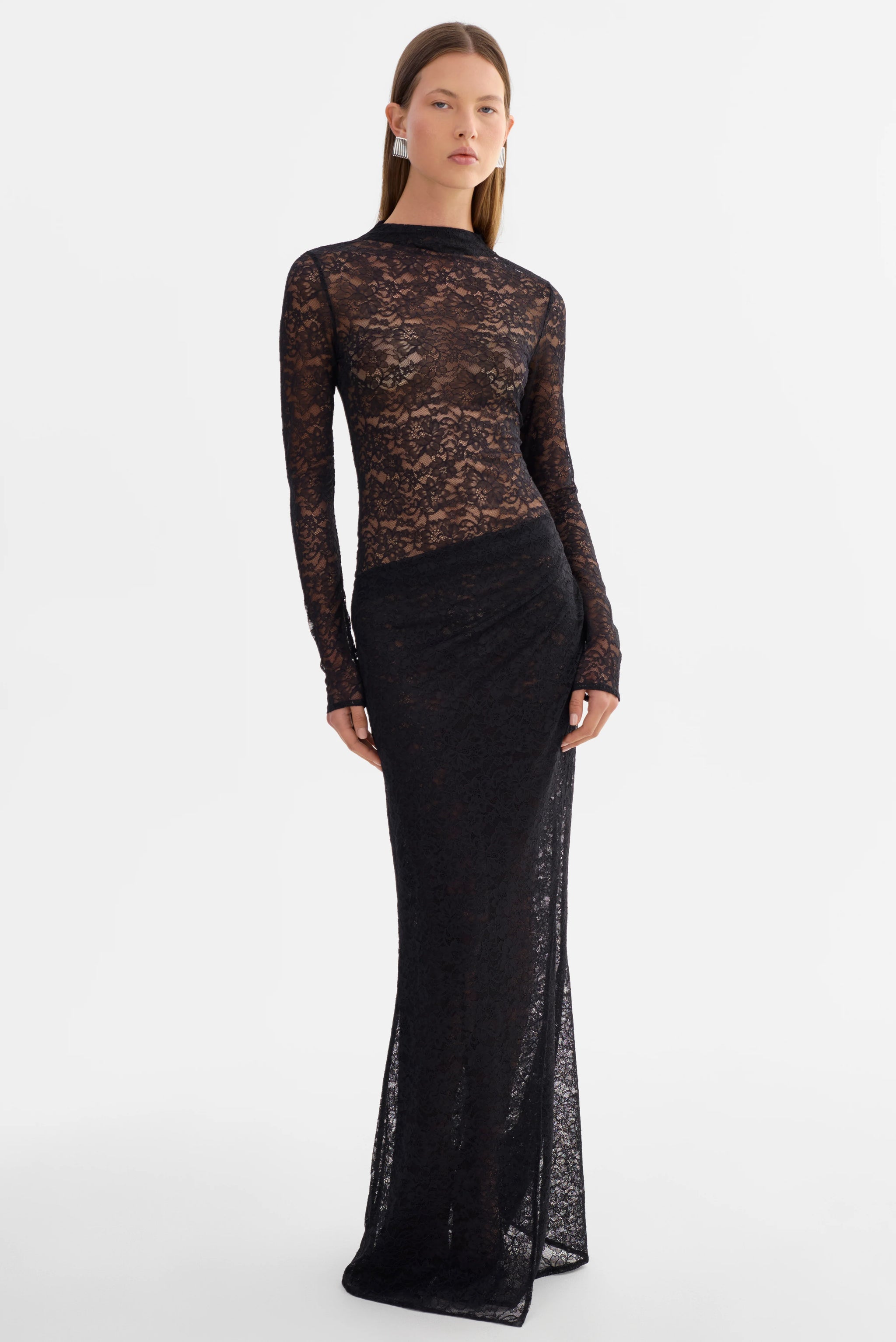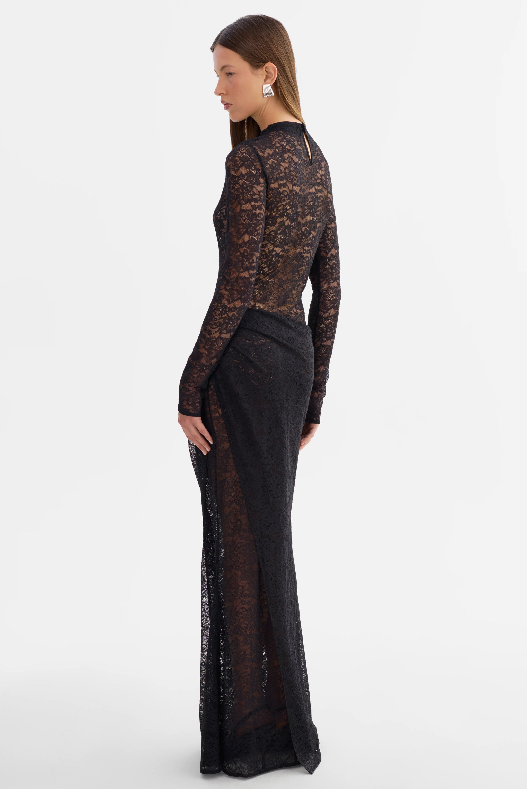 The KRYSTA Lace Maxi Dress embodies dramatic elegance in sheer stretch lace. With its fitted long-sleeve silhouette, slight mock neck, and fluid mermaid hem, it...